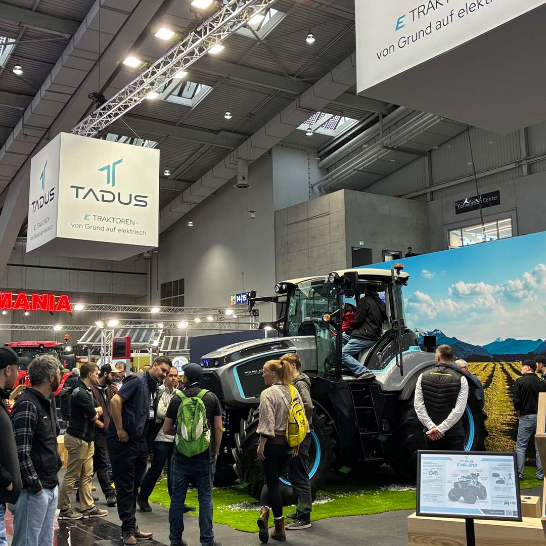 Am Tadus-Stand in Halle 7 herrscht dichtes GedrĂ€nge â Dr. Baier und sein Team haben in ĂŒberraschend kurzer Zeit einen vollelektrischen Traktor entwickelt, der massiv Aufmerksamkeit auf sich zieht.